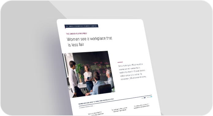 26 | WOMEN IN THE WORKPLACE: THE UNEVEN PLAYING FIELD THE UNEVEN PLAYING FIELD Women see a workplace that is less fair Similar to last year, 45% of men think women are well represented in leadership when 1 in 10 senior leaders in their company is a woman. By comparison, 28% of women think this. WOMEN ARE LESS LIKELY TO THINK THEIR WORKPLACE IS FAIR % OF EMPLOYEES WHO FEEL . . . MEN WOMEN Ideas are judged by their The best opportunities go to the Promotions at this company are quality, not by who raised them most deserving employees based on fair and objective criteria S S S OMEN OMEN OMEN TINA OMEN OMEN OMEN OMEN OMEN TINA OMEN OMEN OMEN OMEN OMEN TINA OMEN OMEN ALL MEN LA ALL MEN LA ALL MEN LA ALL W SIAN W CK W ALL W SIAN W CK W ALL W SIAN W CK W WHITE W A BLA WHITE W A BLA WHITE W A BLA LESBIAN W LESBIAN W LESBIAN W