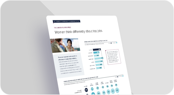 31 | WOMEN IN THE WORKPLACE: THE UNEVEN PLAYING FIELD THE UNEVEN PLAYING FIELD Women think differently about top jobs WOMEN ARE LESS INTERESTED IN GETTING TO THE TOP % OF EMPLOYEES WHO WANT TO BE A TOP EXECUTIVE MEN WOMEN ALL MEN ALL WOMEN This year men and women are There are important racial and ethnic less likely to aspire to be top differences in leadership ambitions. WHITE WOMEN executives than in previous Men and women of color are far more ASIAN WOMEN years—and the decline is greater among men. In 2017, interested in becoming a top executive 52% of men and 39% of than their white counterparts. And LATINAS women wanted to make it to compared to all other groups of women, the top of their company. BLACK WOMEN Asian women are more likely to want to be promoted and to aspire to be a top leader. LESBIAN WOMEN WOMEN AND MEN HAVE DIFFERENT MOTIVATIONS FOR WANTING TOP JOBS MOTIVATIONS FOR WANTING TO BE A TOP EXECUTIVE MEN WOMEN ALL WHITE ASIAN BLACK LESBIAN ALL MEN WOMEN WOMEN WOMEN LATINAS WOMEN WOMEN Financial rewards/security Opportunity to be a role model for others like me Opportunity to impact the success of my company Opportunity to influence the culture of my workplace Opportunity to use my position to have a positive impact on the world Recognition of my achievements and success