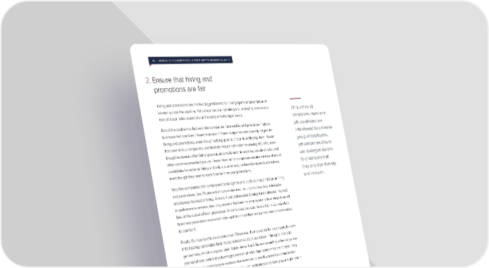 35 | WOMEN IN THE WORKPLACE: A ROAD MAP TO GENDER EQUALITY 2. Ensure that hiring and promotions are fair Hiring and promotions are the two biggest levers for changing the representation of women across the pipeline. Yet companies are not hiring and promoting women and Only a third of men at equal rates, especially at the entry and manager levels. companies make sure Part of the problem is that very few companies have end-to-end processes in place job candidates are to ensure fair practices. Fewer than one in three companies sets diversity targets for interviewed by a diverse hiring and promotions, even though setting goals is critical to achieving them. Fewer group of employees, than one in four companies uses tools to reduce bias when reviewing résumés, even yet companies should though reviewers often fail to give equal consideration to women, people of color, and other underrepresented groups. Fewer than half of companies require diverse slates of use strategies like this candidates for external hiring and only a quarter require them for internal promotions, to underscore that even though they lead to more diverse hires and promotions. they prioritize diversity Very few companies train employees to recognize and push back against bias in hiring and inclusion. and promotions. Just 19 percent of companies require unconscious bias training for employees involved in hiring. A mere 4 percent require training for employees involved in performance reviews. And only about a third remind employees to take steps to avoid bias at the outset of both processes. Unconscious bias can have a big impact on who’s hired and promoted—and who’s not—and it’s critical that companies take concrete steps to counter it. Finally, it’s important to track outcomes. Otherwise, it’s impossible for a company to know if it’s treating candidates fairly. Many companies track outcomes in hiring to check for gender bias, which is a good start. But far fewer track the compounding effect of gender and racial bias, which disadvantages women of color. And companies are far less likely to track bias in performance reviews—for example, to see if women’s communication styles are criticized more often than men’s—yet performance reviews play a major role in who gets promoted and who doesn’t. Until companies hire and promote women at the same rates as men, we won’t see progress in the representation of women in corporate America. Ensuring that these processes are fair is vital to that goal.
